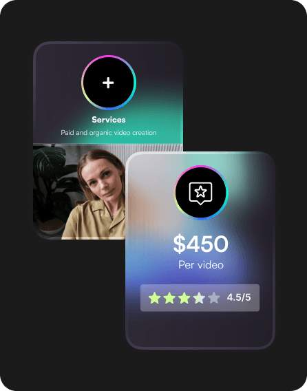 All the tools you need to build, grow, and monetize your UGC career. Create a portfolio, streamline payments and get paid instantly, and track performance—all in one place.