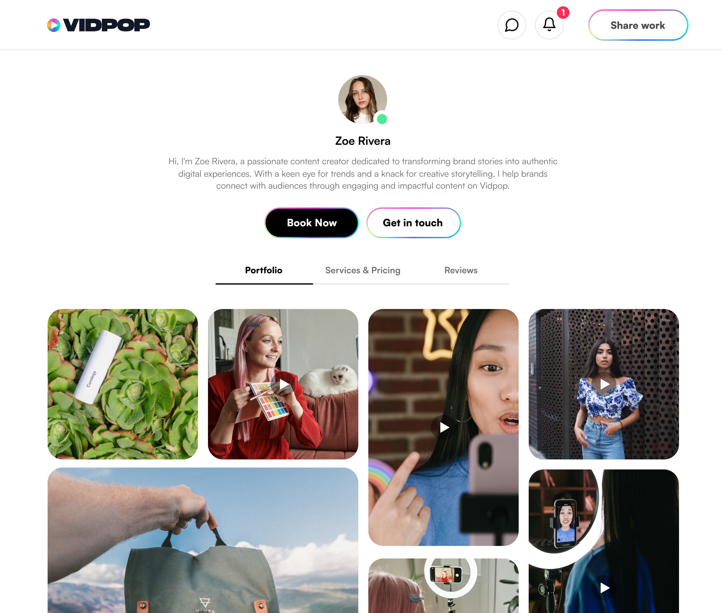 Your Vidpop portfolio is your digital home base — it’s how you showcase your work, attract brands, and grow your career as a UGC creator. Whether you're just starting out or going full-time, having a professional page makes it easy to show off your best content, get discovered, and land paid gigs. With Vidpop, you can customize your page, message with brands directly, get paid securely, and even browse other creator ads for inspiration — all in one place.
